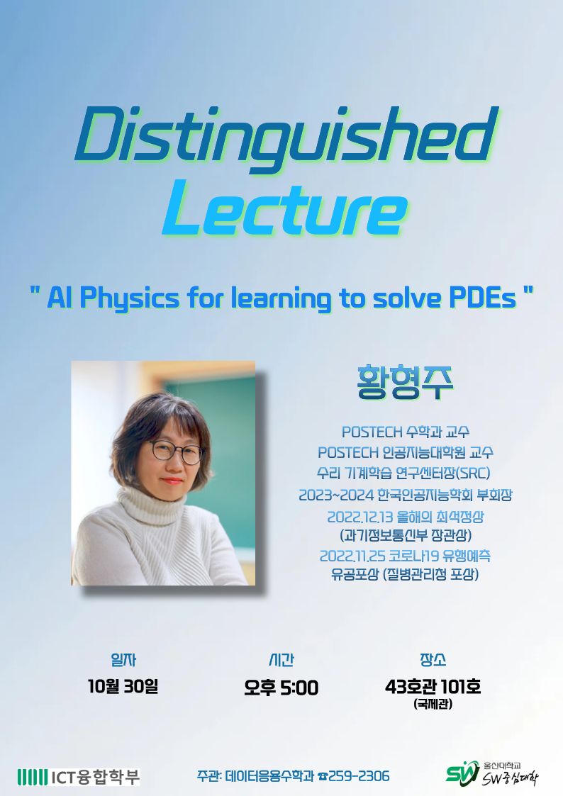 AI분야에서 저명하신 POSTECH 황형주 교수님을 모시고 강연회를 진행합니다. 주제: “AI Physics for learning to solve PDEs” 일시: 10월 30일(목) 오후 5시 장소: 43-101호 (국제관) 학생여러분의 많은 참여 바랍니다. 고맙습니다. 문의: 259-2306 (학과사무실) |