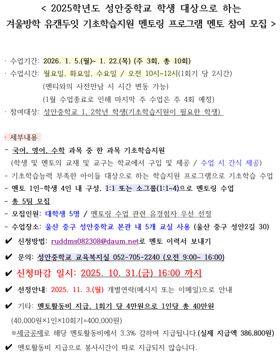 2025학년도 성안중학교 겨울방학 기초학습지원 멘토링 프로그램 대학생 멘토 참여자 모집 및 신청 안내.pdf